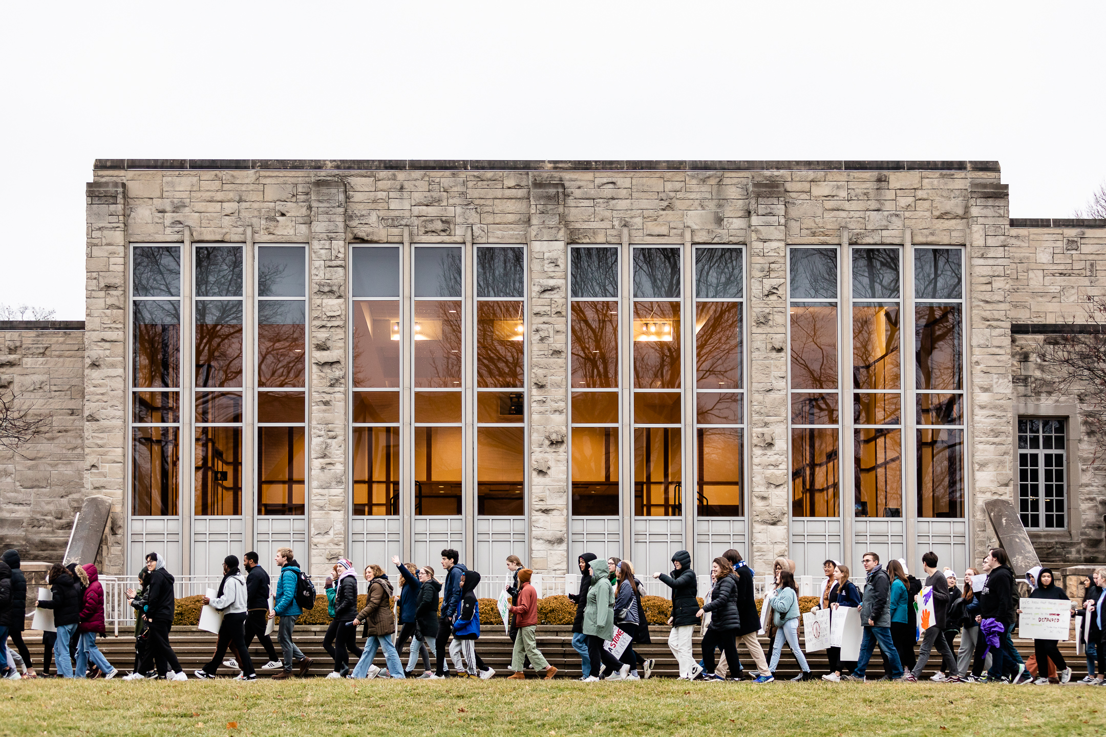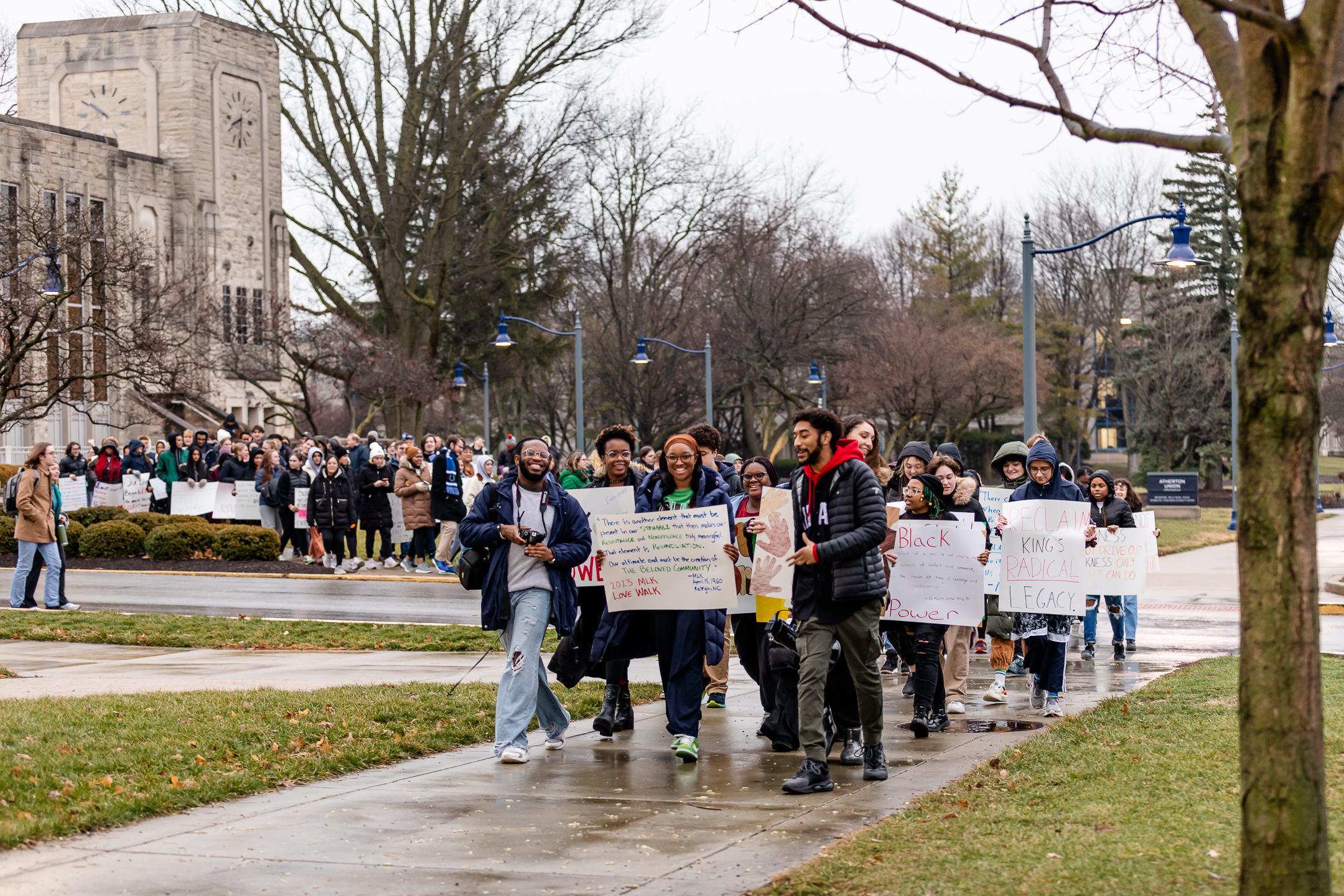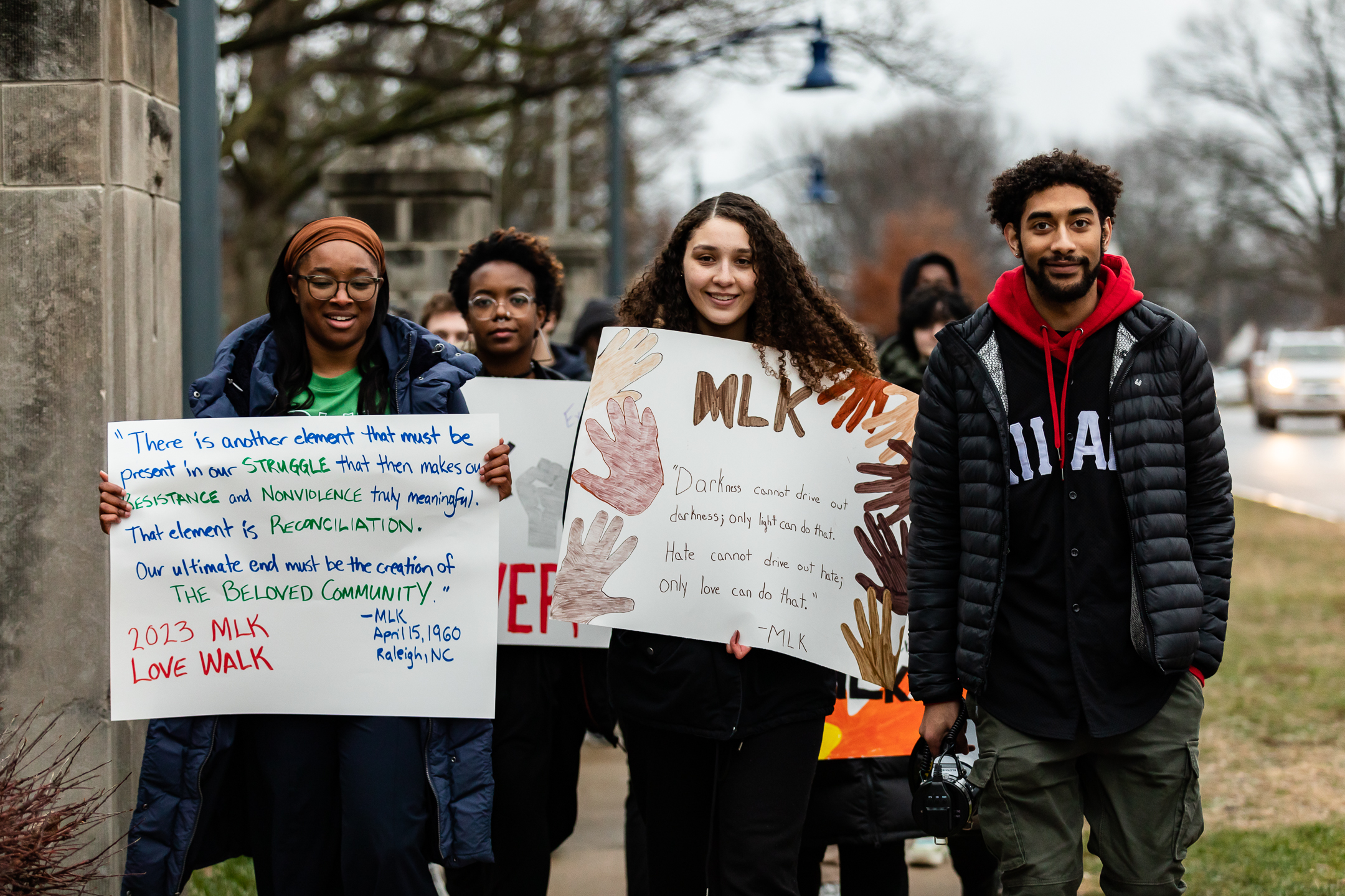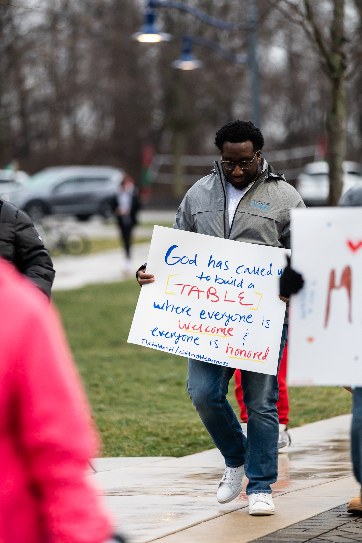 Butler University’s Bust the B.U.B.B.L.E organization partnered with the Black Student Union, Diversity Program Council, Hub for Black Affairs and Desmond Tutu Peace Lab in hosting their 8th annual MLK Love Walk on Monday, Jan. 16. Students, faculty and community members joined together in the Reilly Room to make posters and reflect on the legacy of Martin Luther King Jr.. Participants listened to a speech by Paul Ford II, the lead organizer for Bust the B.U.B.B.L.E., and then marched across campus boasting colorful posters in support of racial justice.