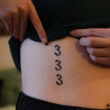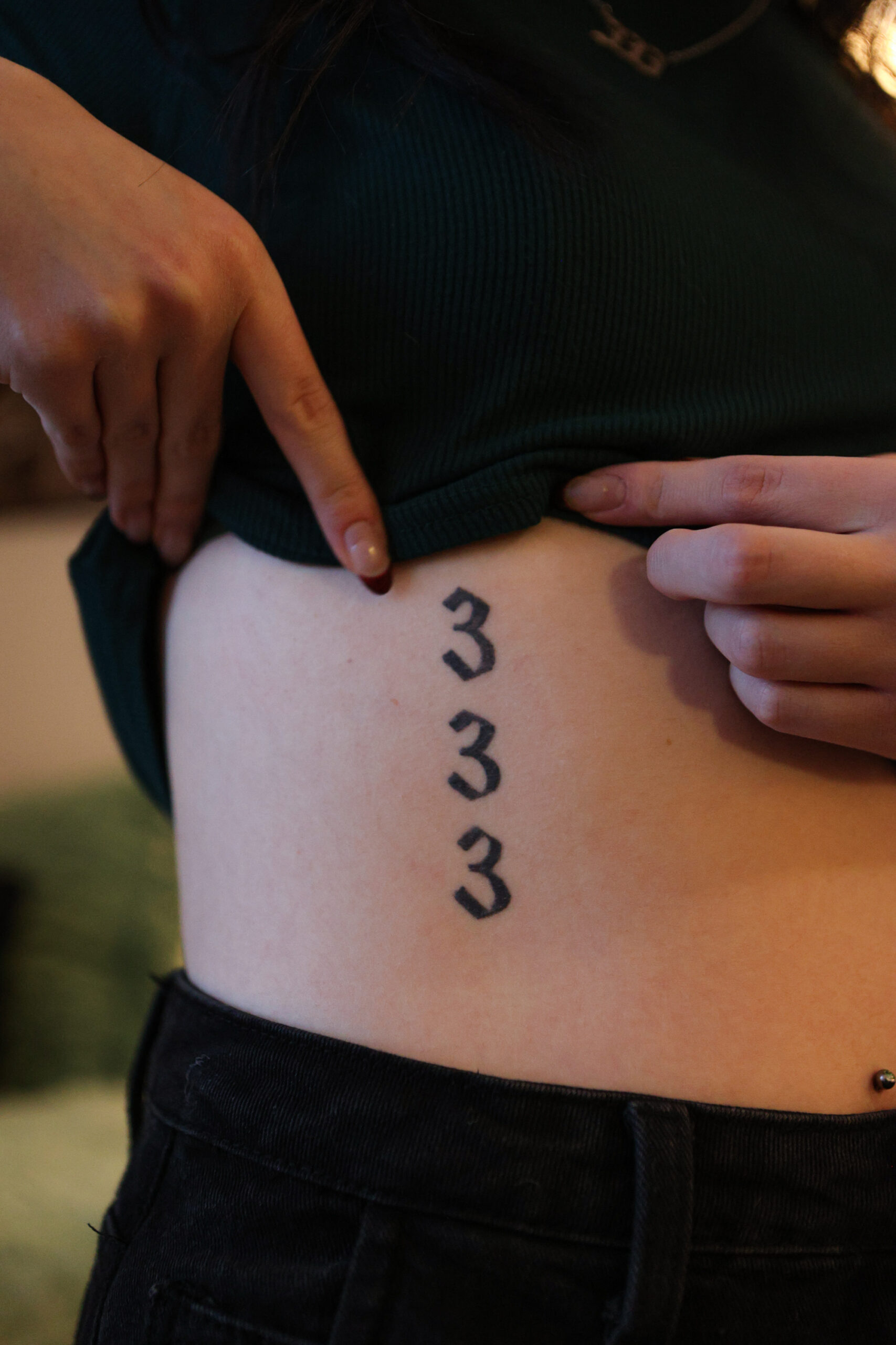 Then, my Mac Miller [tattoo], matching with my brother. On my stomach, I have 333, my angel numbers. Then these weird looking sun and moon people. [They] have feminine bodies, but then the head of a moon and the head of the sun. [On] my thigh [I have] another Mac Miller one for the song “Surf.” It’s a body with flowers growing out of it and a watering can. The lyrics are “There’s water in the flowers, let’s grow.”