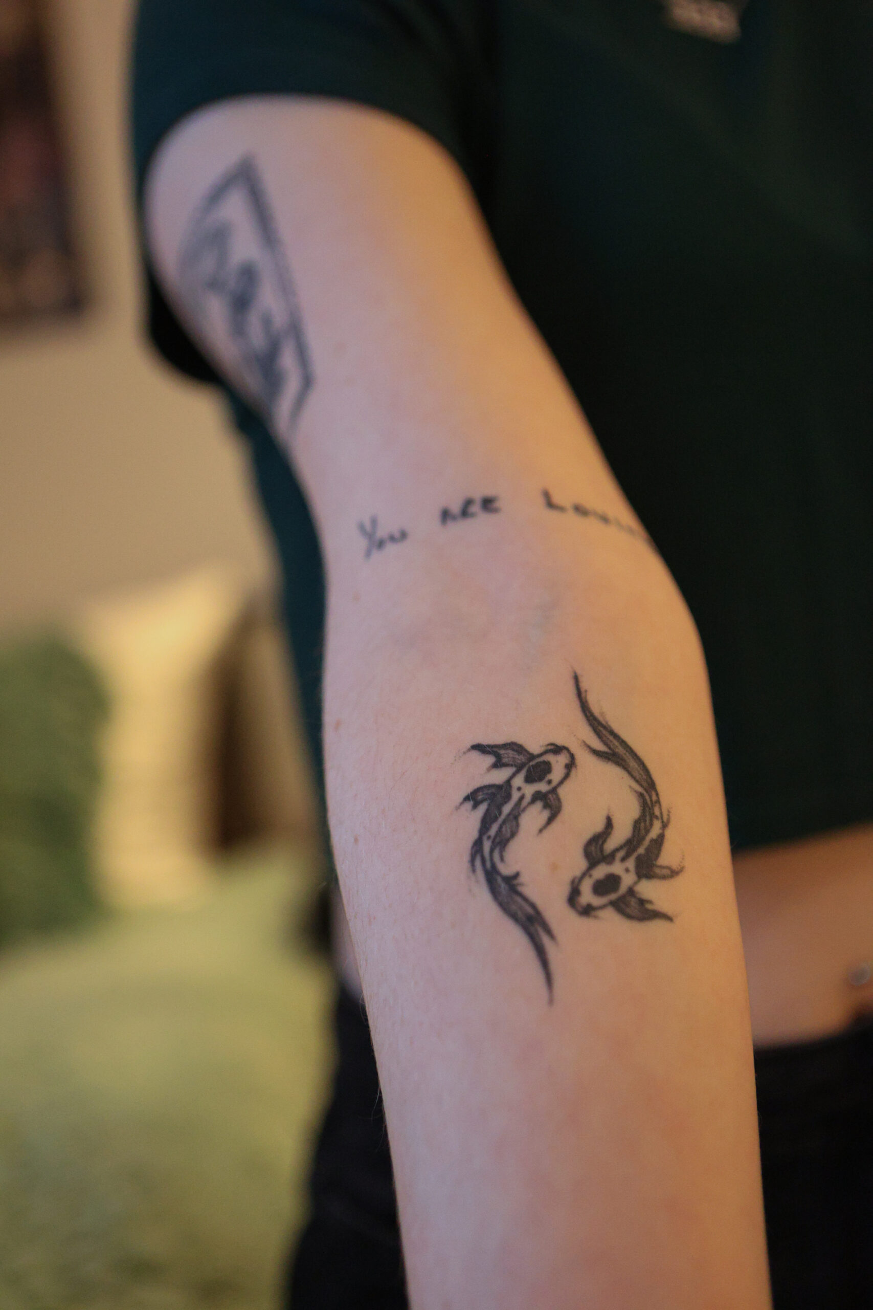 LS: I have “Divine Feminine” on the top of my back [and the] bottom of my neck. On my right arm, I have a postage stamp with poppies and strawberries and an eight on it for August, which is my birthday month. Then, I have “You are loving” in my dad’s handwriting from a note that he wrote me before I went off to college. I have two koi fish which represent perseverance, and they’re in the shape of the eating disorder recovery logo. On my left arm, I have my “We’ll be alright.”