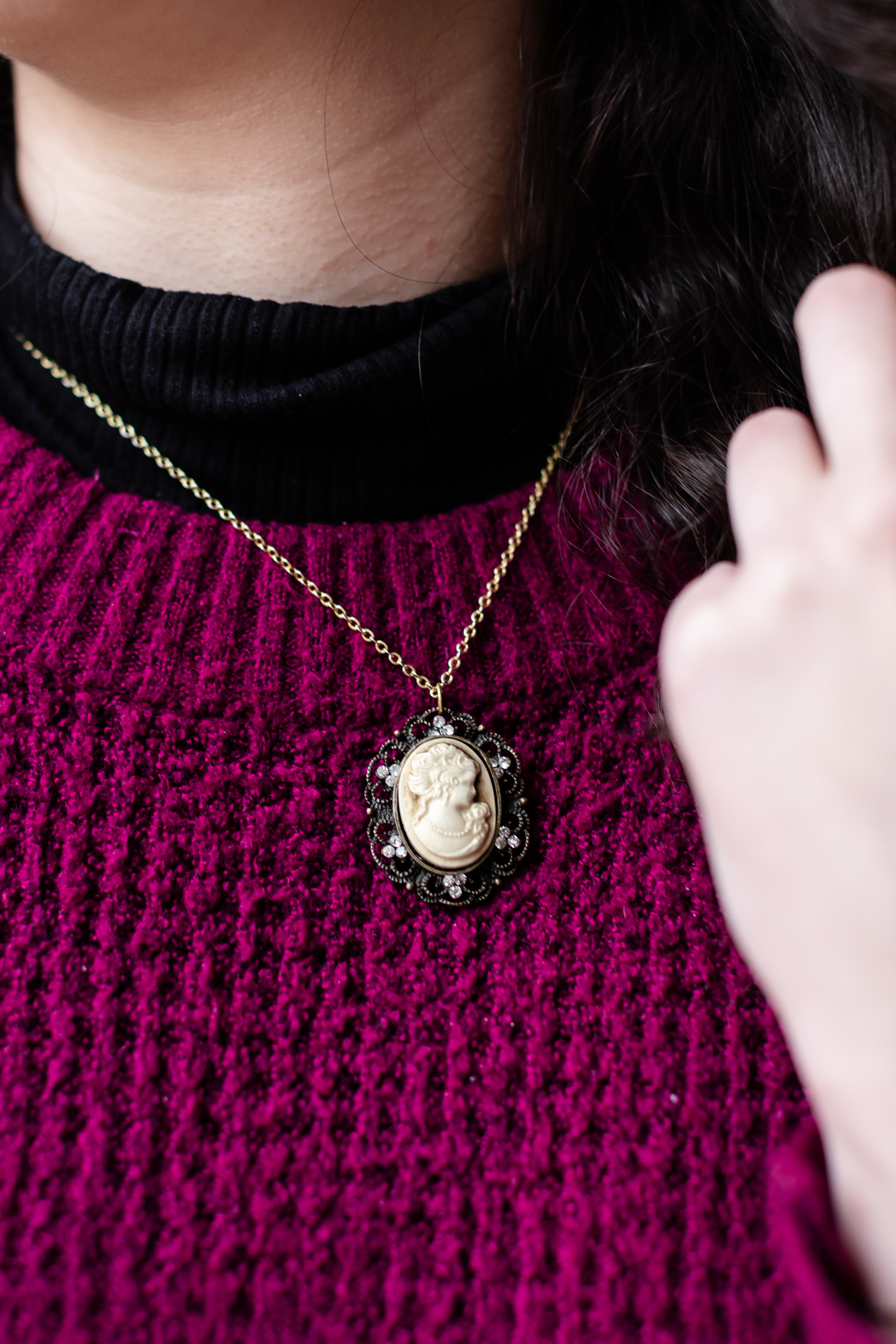 Sophomore Evelyn Stewart wears a cameo brooch and a knit sweater to encapsulate her 1940s-inspired style. Photos by Lauren Gdowski.