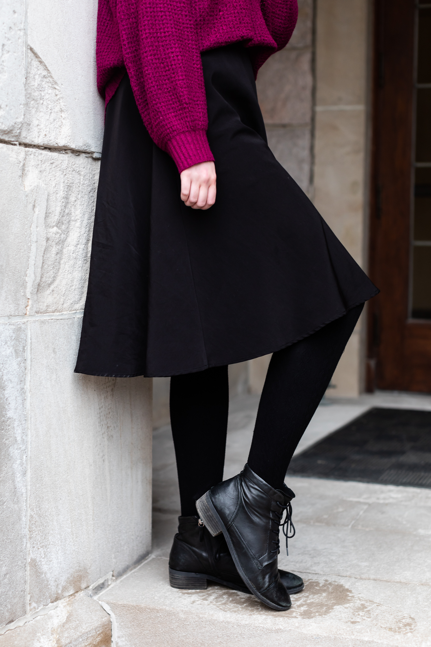 Top wise, [one essential for me is] a sweater. I have a bulky sweater on right now, but then I have a lot of tighter fit sweaters as well that I’ll put on over [as a top layer], and that combination of that skirt, an undershirt and then a sweater over it for me is very much like, “Oh yeah, that’s safe. I can just do whatever I want there.”