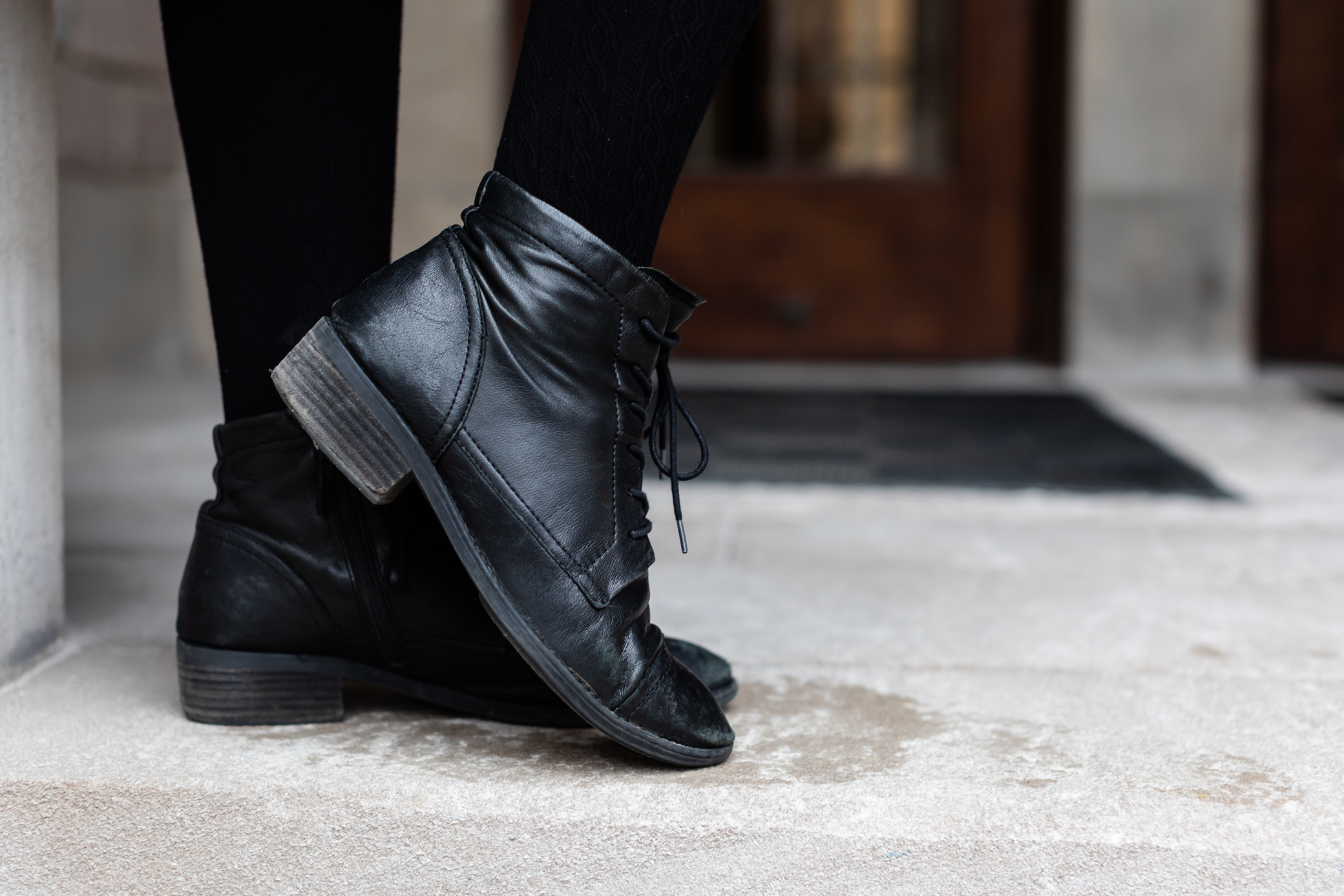 A pair of black boots that I wear almost every day. They are leather, they’re lace-up, they’re black, they go with everything, and they are a little bit historical-esque minus the zipper on the side.