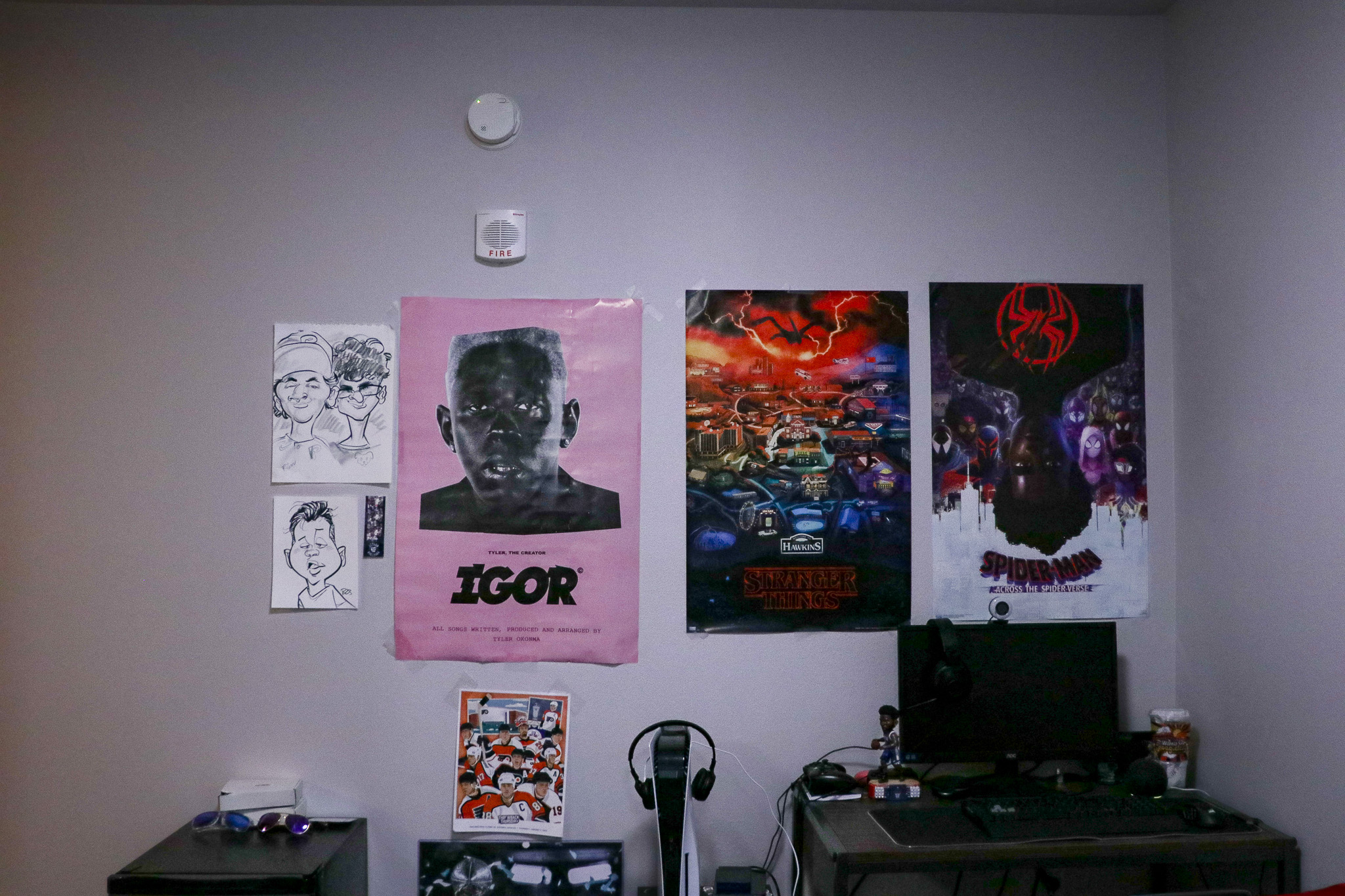 Ethan Gutsche’s colorful desk setup and posters remind him of home. Photo by Natalie Goo.
