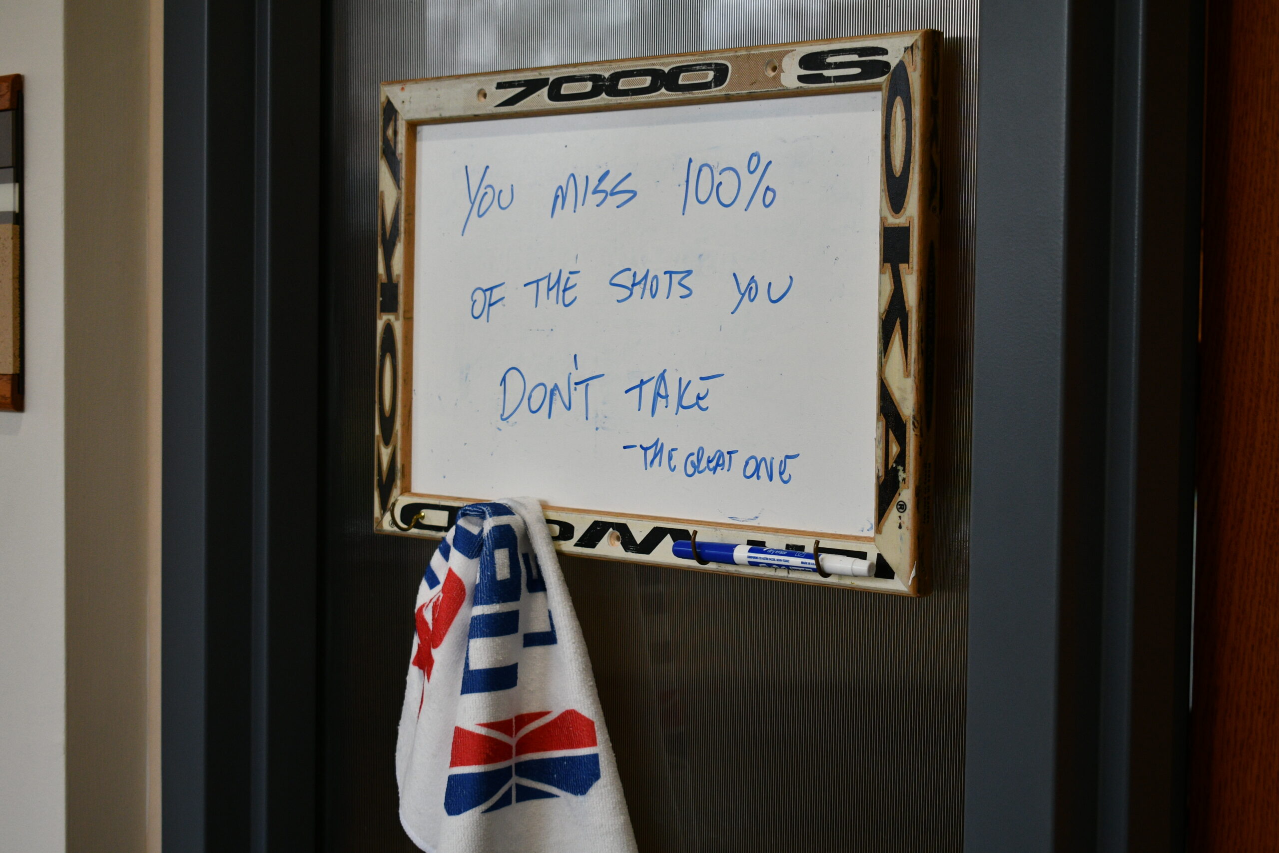 White showcases inspirational quotes on his whiteboard. Photo by Elle Rotter.
