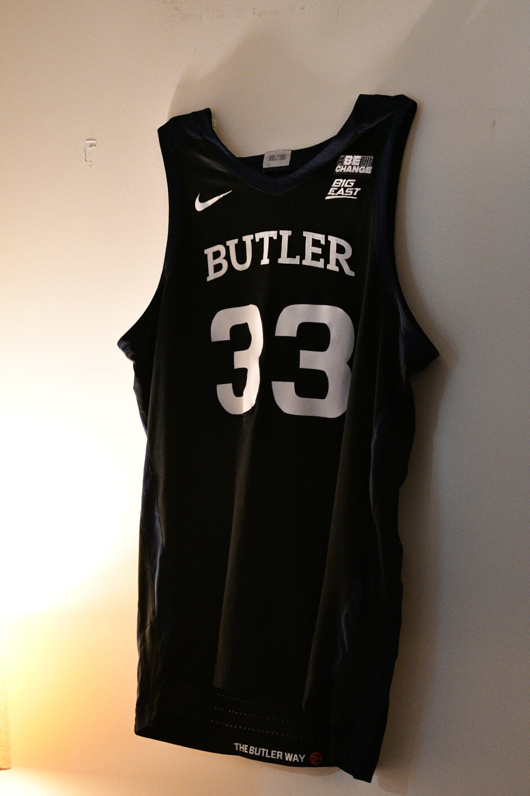 Bryce Golden’s old jersey is pinned up on White’s office wall. Photo by Elle Rotter