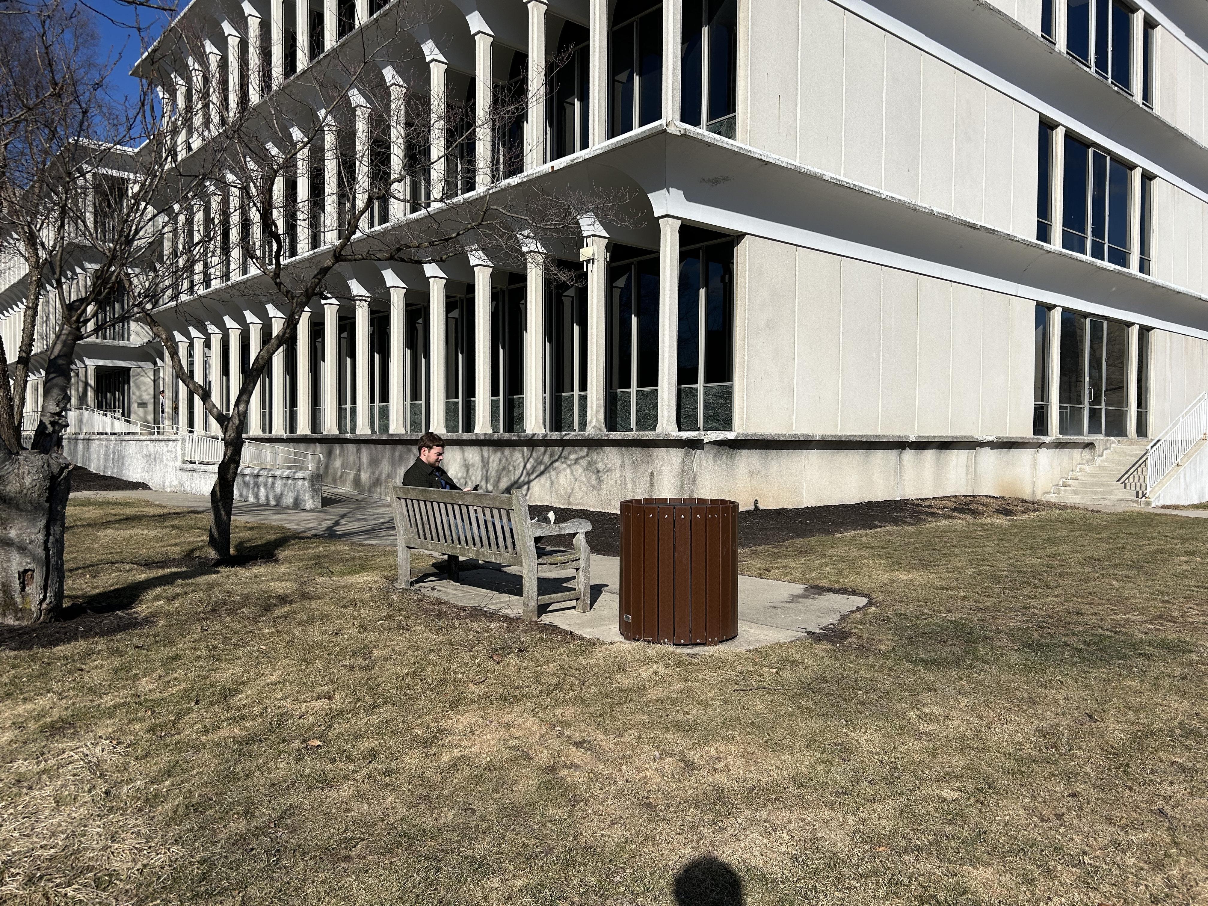 The back of Lilly Hall and the parking lot can be jarring, but it is cool to look beyond them to see all of the activity on the Atherton Mall on warm days. Robertson Hall, which can be seen off to the right, is a beautiful building surrounded by woods. These are also a different style of bench from most on campus, made of plastic rather than wood, so they are sturdier and cleaner.