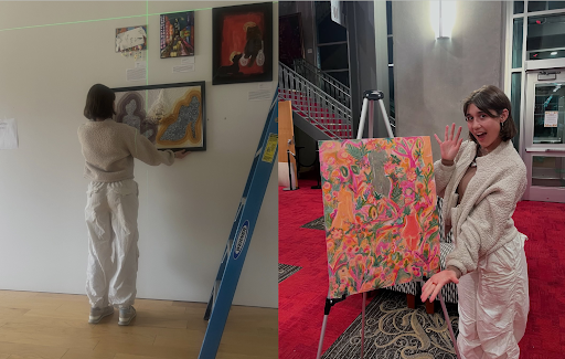 Left: Sierazy hanging her piece “Alejandra y Ali,” recently sold to Student Government Association (SGA). Right: Sierazy with a piece created for Butler Survivors Alliance. Photos courtesy of Alejandra Sierazy.