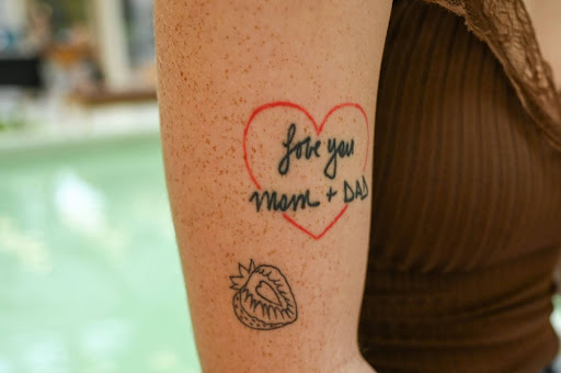 Lance’s Valentine’s card tattoo, featuring the actual handwriting of her parents. Photo by Darcy Leber.