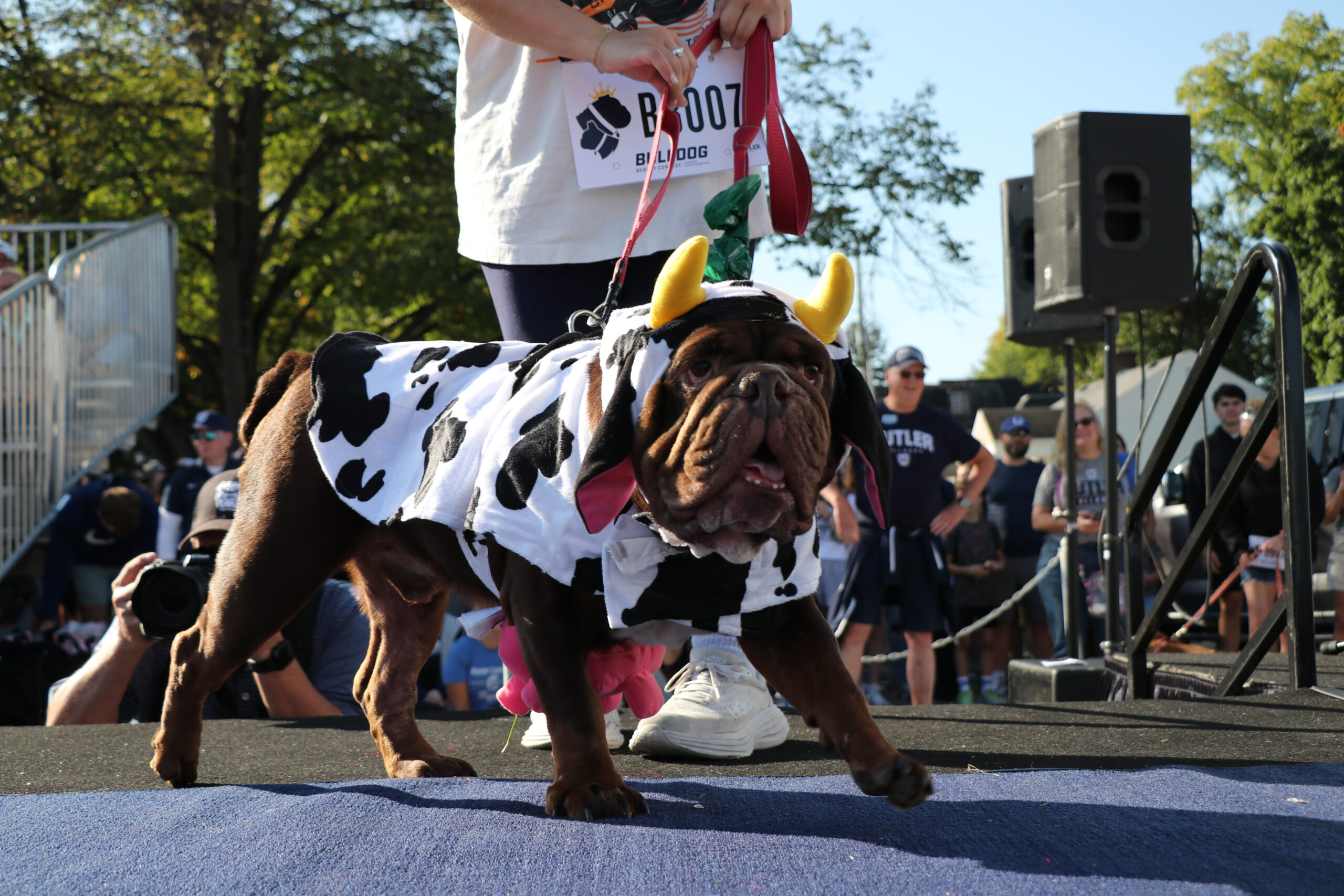 Bulldog Beauty Contest winner, Cowboy, shows off his costume on stage. Photo by Jonathan Wang.