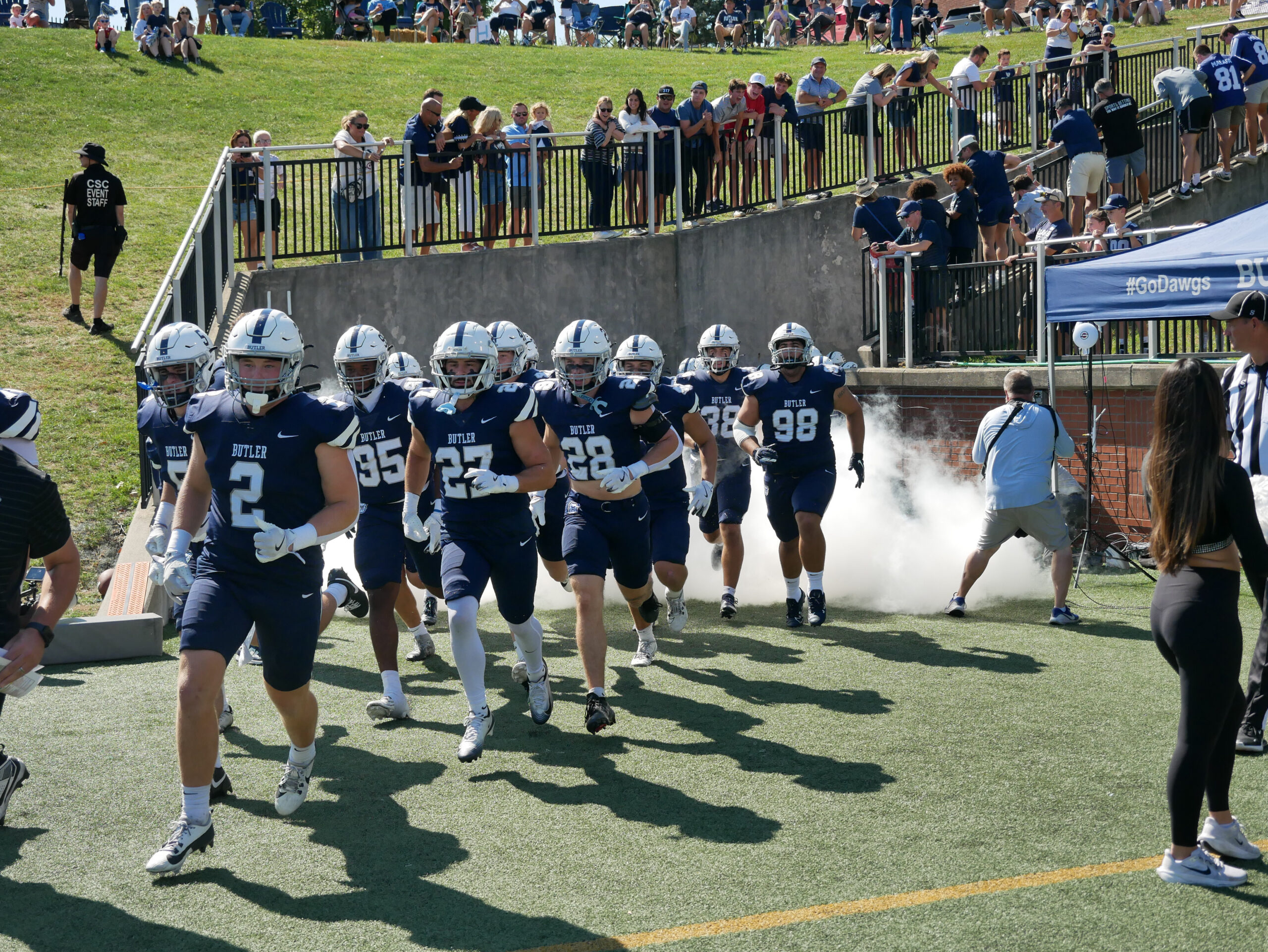 The Butler Bulldogs football team takes the field ahead of their 31-28 win over Marist. Photo by Jonathan Wang.