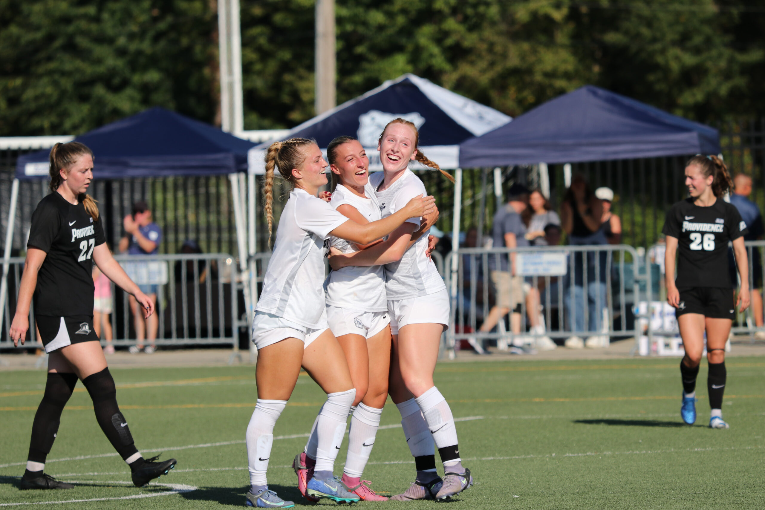 The women’s soccer team celebrates 3-1 win over Providence at their Senior Day game. Photo by Jonathan Wang.