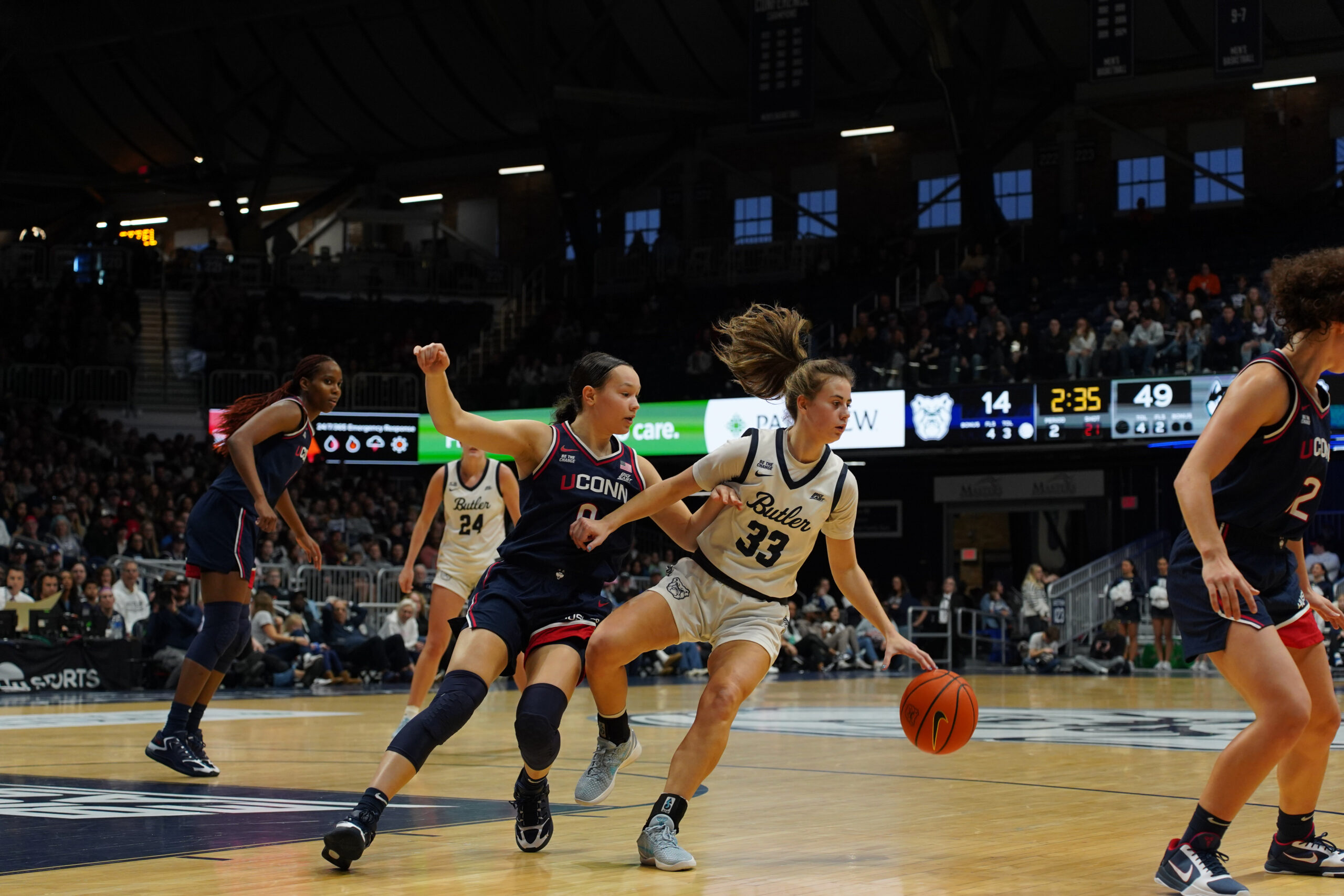 The women’s basketball team faced its stiffest test of the season on Dec. 28 at Hinkle Fieldhouse, toppling 94-47 to No. 1 UConn. The loss drops the Bulldogs to 7-7 overall and 1-3 in conference play, while the unbeaten Huskies improved to 13-0.