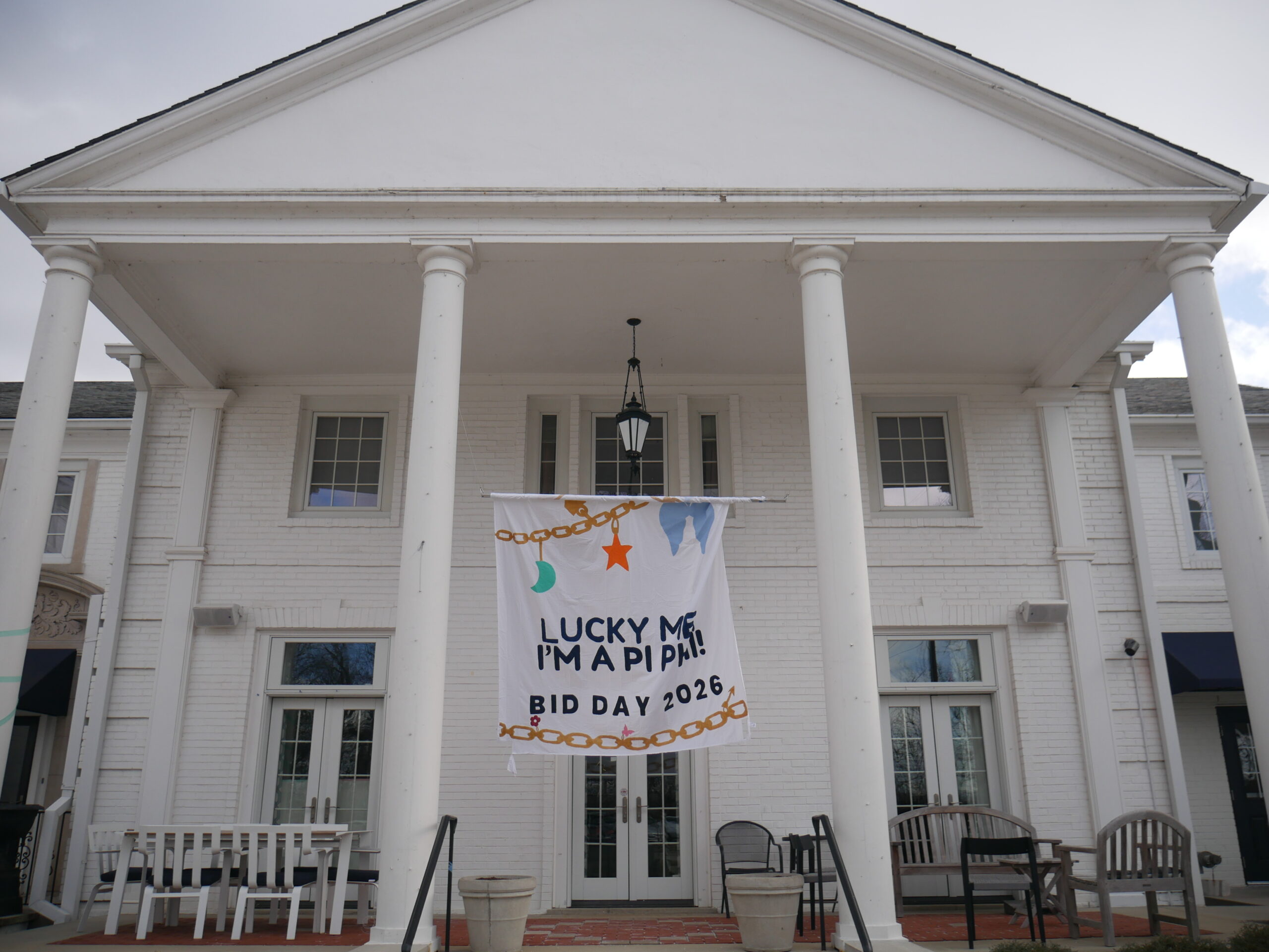 Pi Beta Phi hung a banner on their house’s porch prior to the start of Continuous Open Bidding. Photo by Alyson Swearingen.