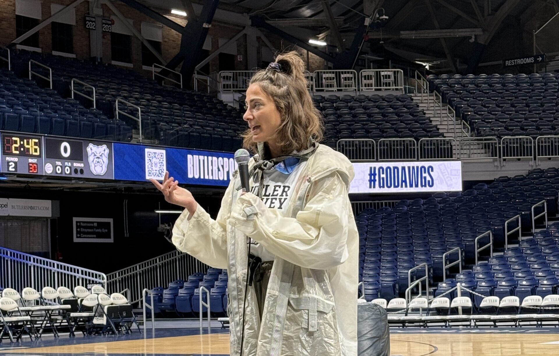 Olympic runner, filmmaker and author Alexi Pappas visited Butler on Feb. 23 to share about mental wellness and navigating nonlinear life paths. She first spoke to a group of female student-athletes in a breakout session in Hinkle Fieldhouse’s Wildman Room, and later at an event on the Hinkle basketball court open to the public.