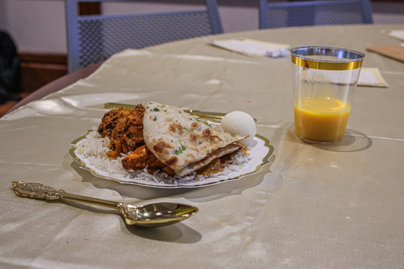 The night started with dinner. The tables were decorated with gold tablecloths, candles, flowers dunked in water and henna. After being called up to eat, guests got up to pick from a large selection of dishes, including butter chicken, seekh kebabs and mango lassi.