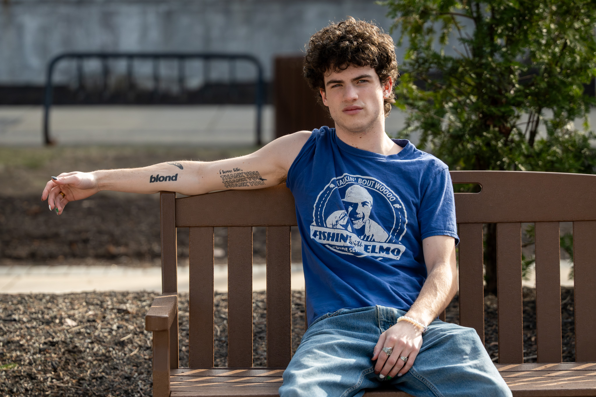 JM BRENNER: I’ve got one Mac Miller tattoo [that] says, “I love life,” [and] “Thank you,” three times — it’s his posthumous album. I’ve also got a butterfly. It’s a self-harm awareness tattoo. I’ve got “blond” by Frank Ocean; that’s my favorite album of all time, [and it] just means a lot to me. I’ve got one on my chest as well. It’s a Daniel Caesar tattoo from “Pilgrim’s Paradise”, which is his 2015 [EP].